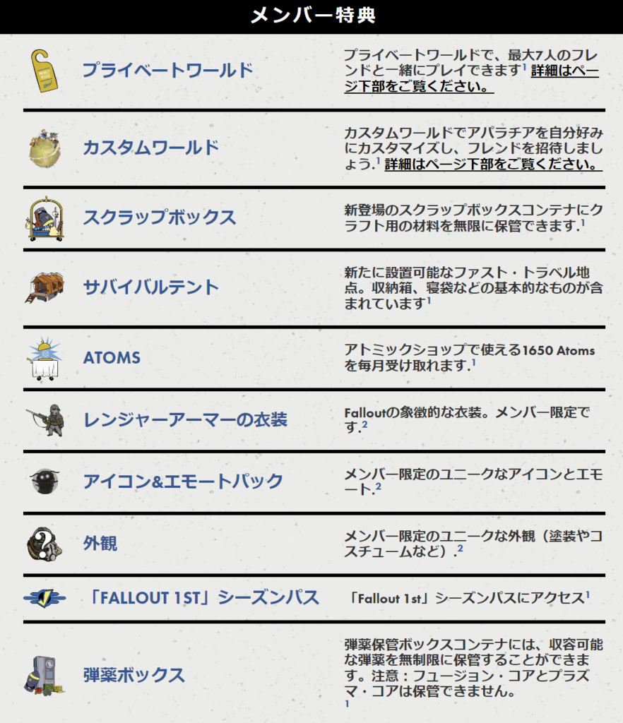 Fallout 1stは、月額課金または年間契約で特典が受けられるサービスです。主な特典は以下の通りです。