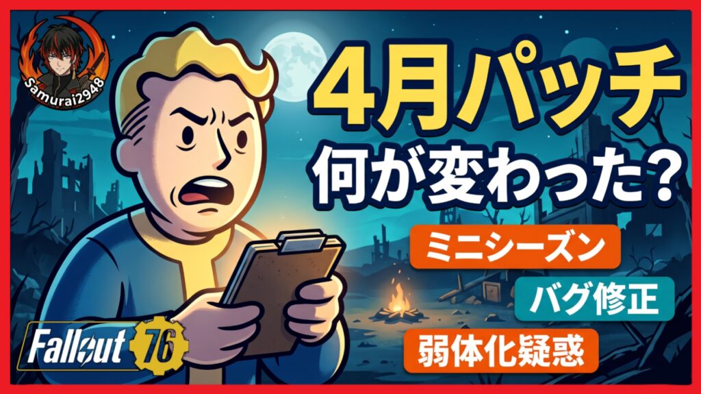 Fallout 76 — Samurai2948 攻略情報 FALLOUT 76 // Wasteland Intel BY SAMURAI2948 | LV.1500+ ⚠ NOTE 掲載情報は運営が意図していない動作・非公式の挙動を含む可能性があります。バグや仕様変更により予告なく内容が変わる場合があります。... -